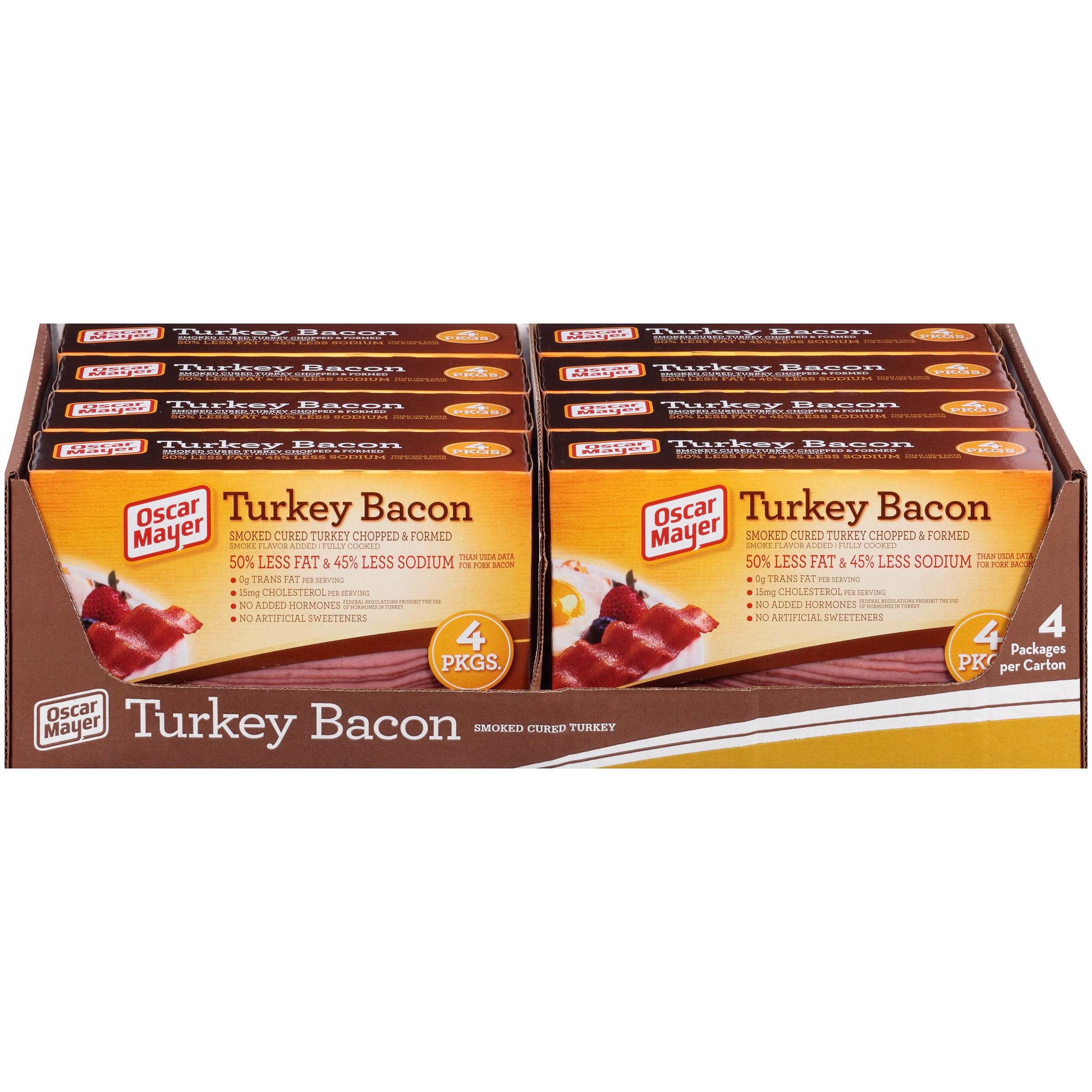 Everything is better with turkey bacon. Oscar Mayer Smoked Cured Turkey, Chopped & Formed, Smoke Flavor Added, has 63% less fat and 57% less sodium than USDA data for pork bacon without sacrificing the flavor you crave. Our fully cooked turkey bacon is raised without hormones as federal regulations prohibit the use of hormones of turkey. Each package of fully cooked turkey bacon minimizes prep time, making it easier to create delicious meals in a hurry. Heat our smoked cured turkey bacon on the stove, in the oven or microwave to your desired crispness. Taste the natural hardwood smoke flavor that makes Oscar Mayer turkey bacon the perfect addition to breakfast sandwiches and BLTs. Enjoy turkey bacon with eggs, try it as a savory salad topping or add some slices to your next turkey burger. Discover the endless possibilities of precooked turkey bacon. Oscar Mayer Smoked Cured Gluten Free Fully Cooked Turkey Bacon is vacuum packed in 4 resealable 12-ounce packages with 71-73 slices total.