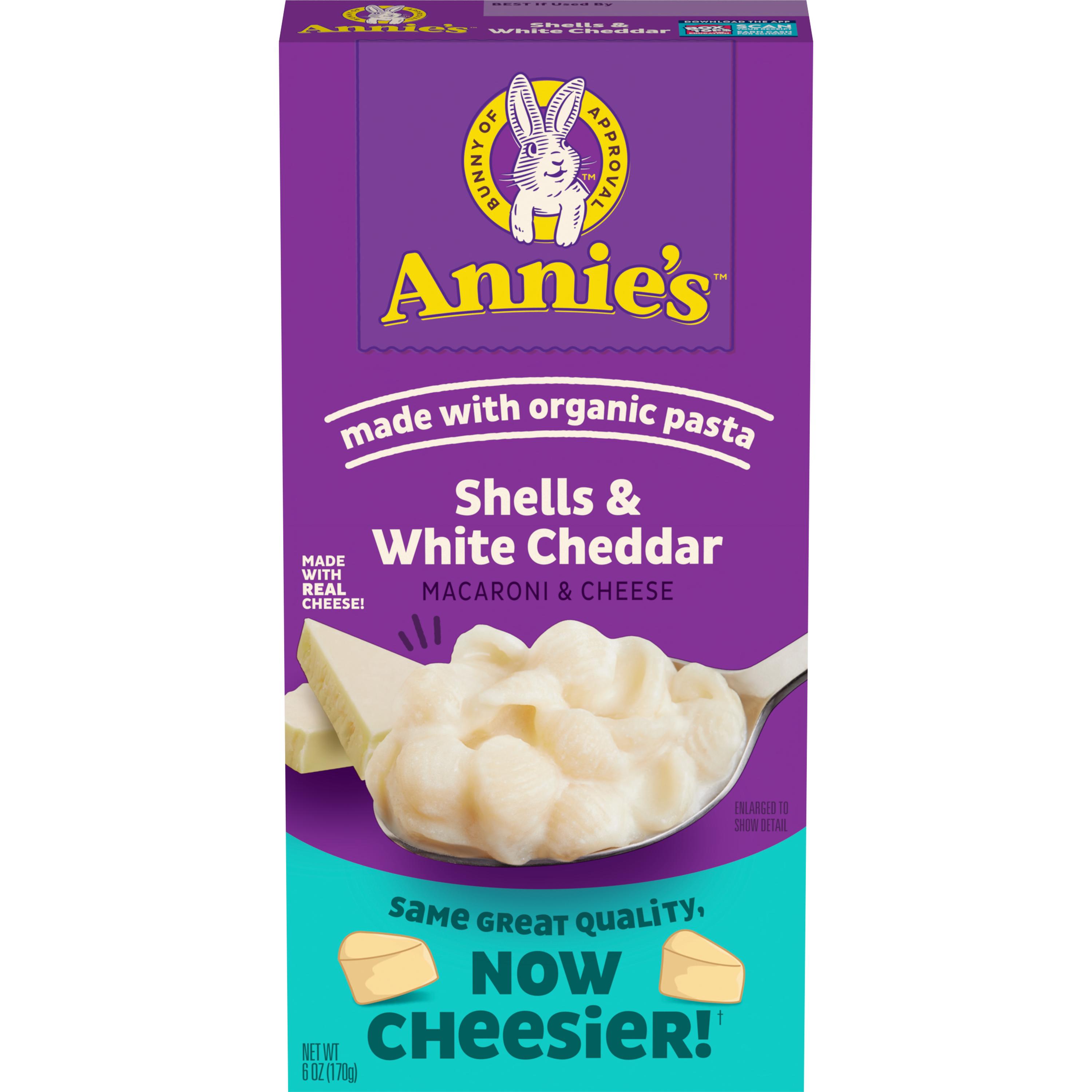 Annie's™ traditional macaroni and cheese is a convenient and tasty kit that consists of organic pasta and a powdered 100% real white cheddar cheese packet. Prepare on stovetop, just add milk and ready in 10 minutes. Bulk packaged in 12 - 6 oz packages. 2.5 servings per package.