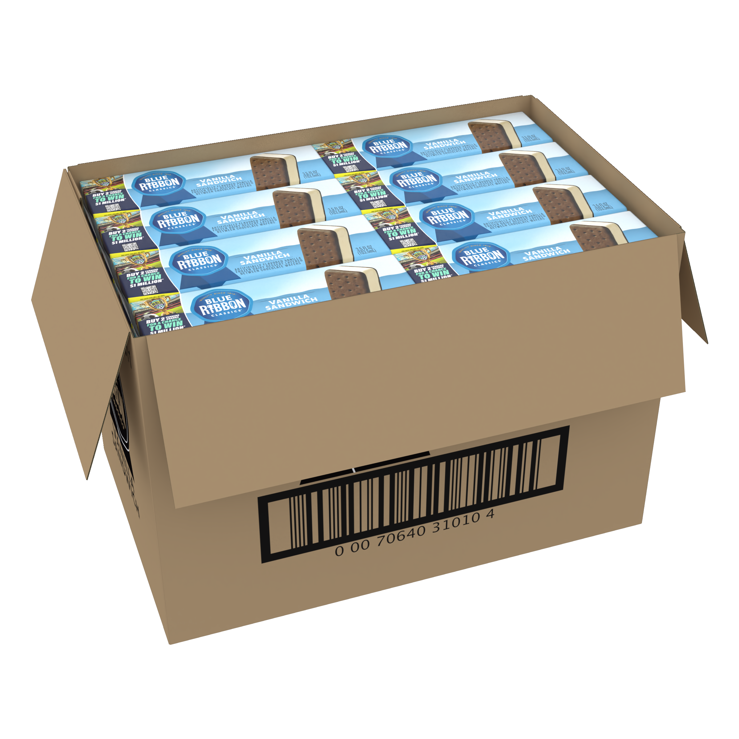Blue Ribbon Classics Vanilla Sandwich offers the irresistible combination of artificially flavored vanilla frozen dairy dessert sandwiched between two chocolate wafers. Each case contains 2/24 packs which makes for a total of 48 individually wrapped rectangular sandwiches that are 3.5 fluid ounces each, allowing for easy, clean serving and storage. Serve it anywhere people crave a satisfying, portable treat: Colleges & Universities, Healthcare, Recreation, Business & Industry, Convenience & Gas. Blue Ribbon Classics Make It Sweet! Wells Enterprises, proudly serving ice cream and other frozen treats since 1913.