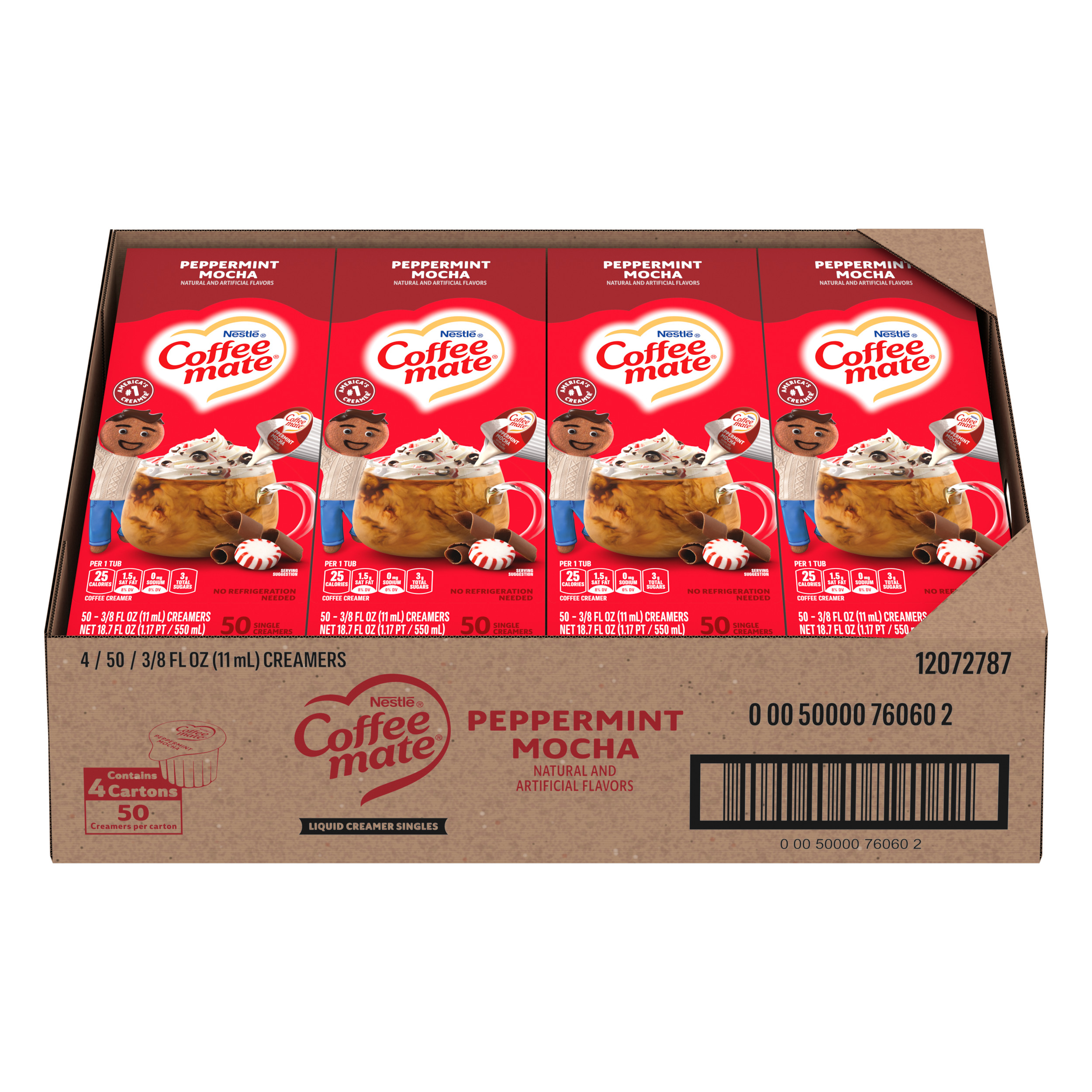 Stir up the perfect cup with Coffee mate, America's #1 creamer brand. Nestle Coffee mate Peppermint Mocha Natural and Artificial flavored liquid creamer singles add cafe mocha flavor with a hint of peppermint to complement your cup of coffee. Available in 4 x 50 count dispenser boxes, it is shelf stable with no refrigeration needed. Coffee mate Peppermint Mocha flavored liquid creamer singles retain their delicious flavor at room temperature for up to 9 months unopened. Find your perfect match with NESCAFE Coffee and Coffee mate Peppermint Mocha flavored liquid creamer singles. Our Coffee mate liquid creamer singles are available in other holiday flavors like Pumpkin Spice Flavored Coffee Creamer. All Coffee mate foodservice single serve creamers are cholesterol-free, gluten free and kosher dairy. With a variety of flavors and formats, Coffee mate has your coffee creamer needs covered. See the full Coffee mate ingredients statement for Coffee mate creamer ingredients.