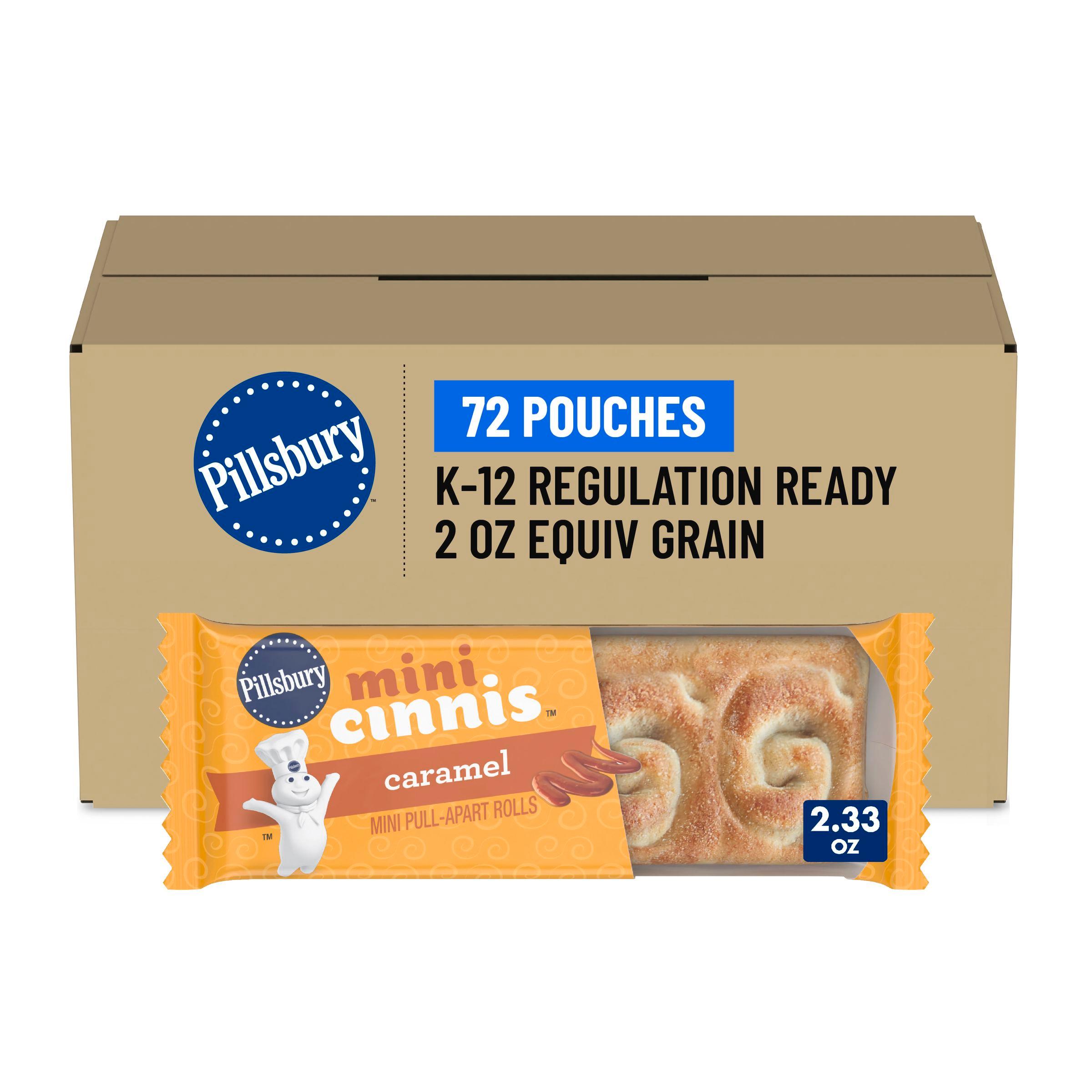 Pillsbury Mini Cinnis offer whole grain-rich mini pull-apart caramel rolls in ovenable individual pouches for convenient heat & serve or thaw & serve preparation. Each serving delivers 16 grams of whole grain and meets USDA's 2 oz equivalent grain standards. Packed with rich caramel flavor, they come 72 pouches per case, making them perfect for breakfast or snack service in K-12 schools.
