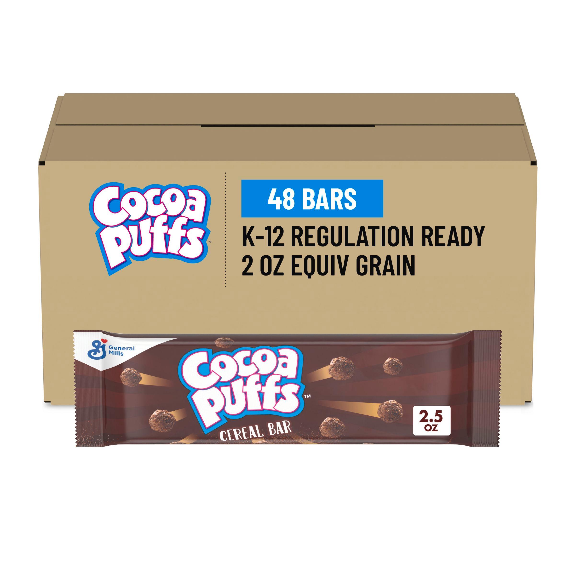 Cocoa Puffs Cereal Bars offer a convenient, portable breakfast or snack option. Made with Cocoa Puffs cereal pieces, these bars meet 2 oz equivalent grain, and whole grain-rich criteria. Smart Snack Entrée Exempt. Individually wrapped for low- mess, they're ideal for classroom or cafeteria settings, grab-and-go situations, and kiosks. Packed in bulk with 48 bars per case, each bar is 2.5 oz, ensuring consistent portions.