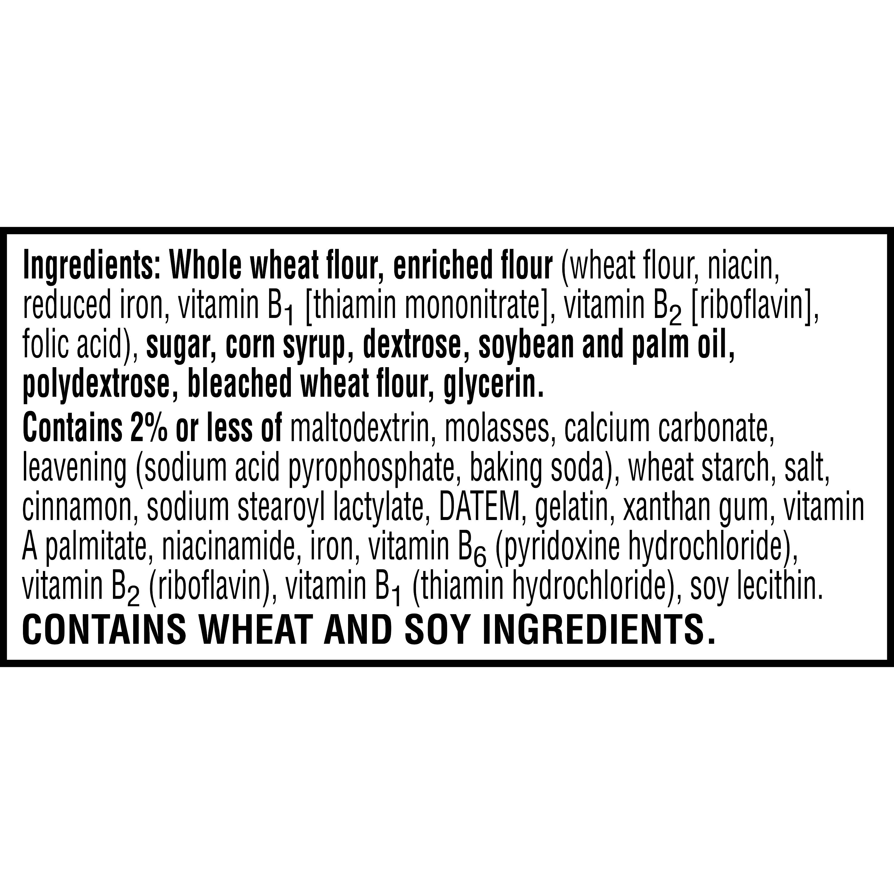 Pop-Tarts toaster pastries are the perfect sweet treat at breakfast, for a lunch snack option, or dessert. Featuring a sweet cinnamon filling in a soft pastry crust, this ready to eat treat is perfect for snack time for kids and adults on the go. Pack Pop-Tarts Frosted Cinnamon in lunchboxes or backpacks when it's time for school snacking, or stock the office pantry with this individually wrapped grab and go adult snack choice. Each serving contains 12g whole grain and includes no artificial flavors or colors, and no high fructose corn syrup.. Great choice for grab and go snacking featuring sweet filling in a soft pastry crust; Perfect sweet treat or lunch snack option.