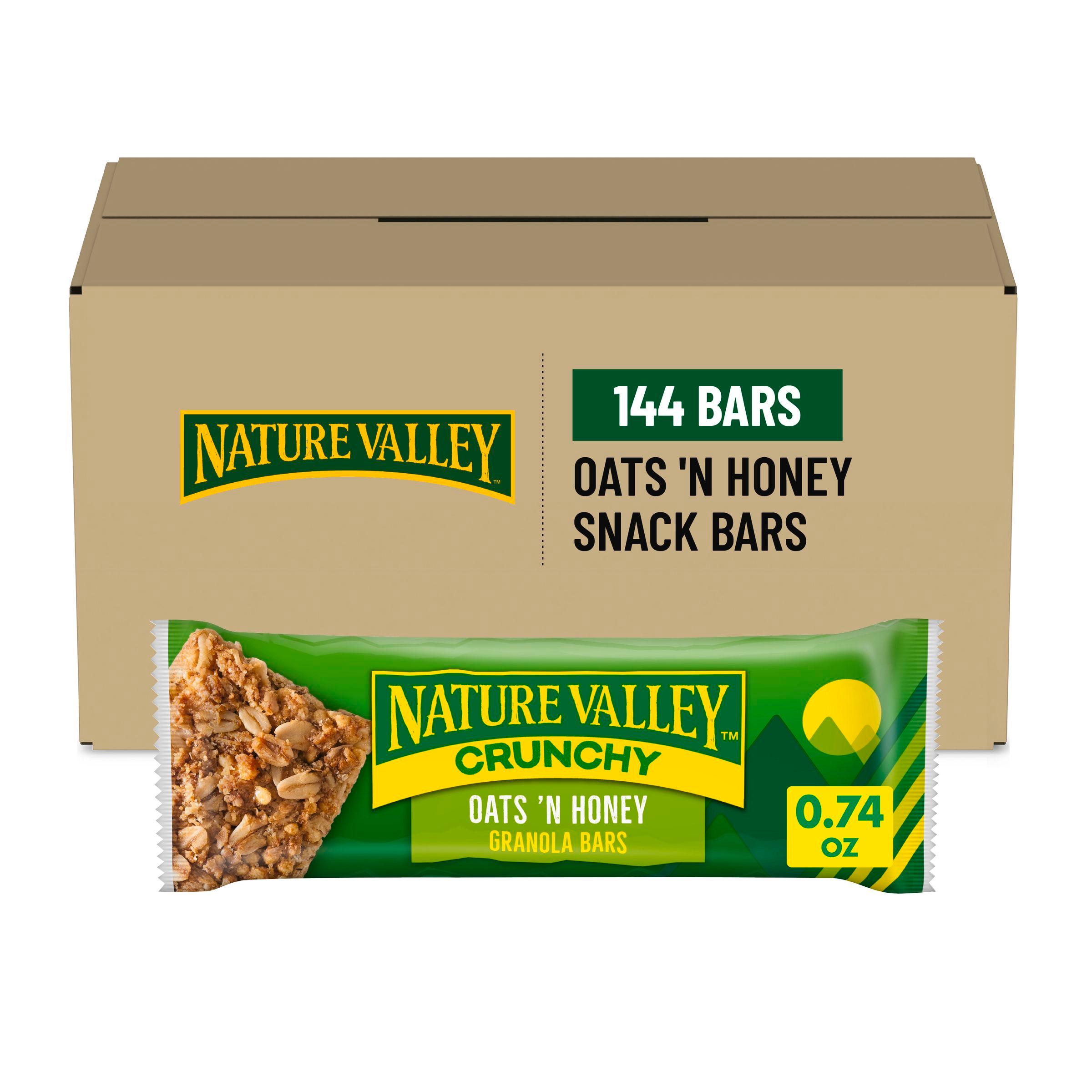 Nature Valley Granola Bars Oats N' Honey are made with real honey and whole grain oats, providing 11g of whole grain per serving (at least 48g recommended daily). These crunchy, individually wrapped bars meet Smart Snacks criteria with a 0.5 oz equivalent grain serving. Ideal for schools, they offer a delicious flavor in a convenient format. Available in bulk with 144 bars per case.