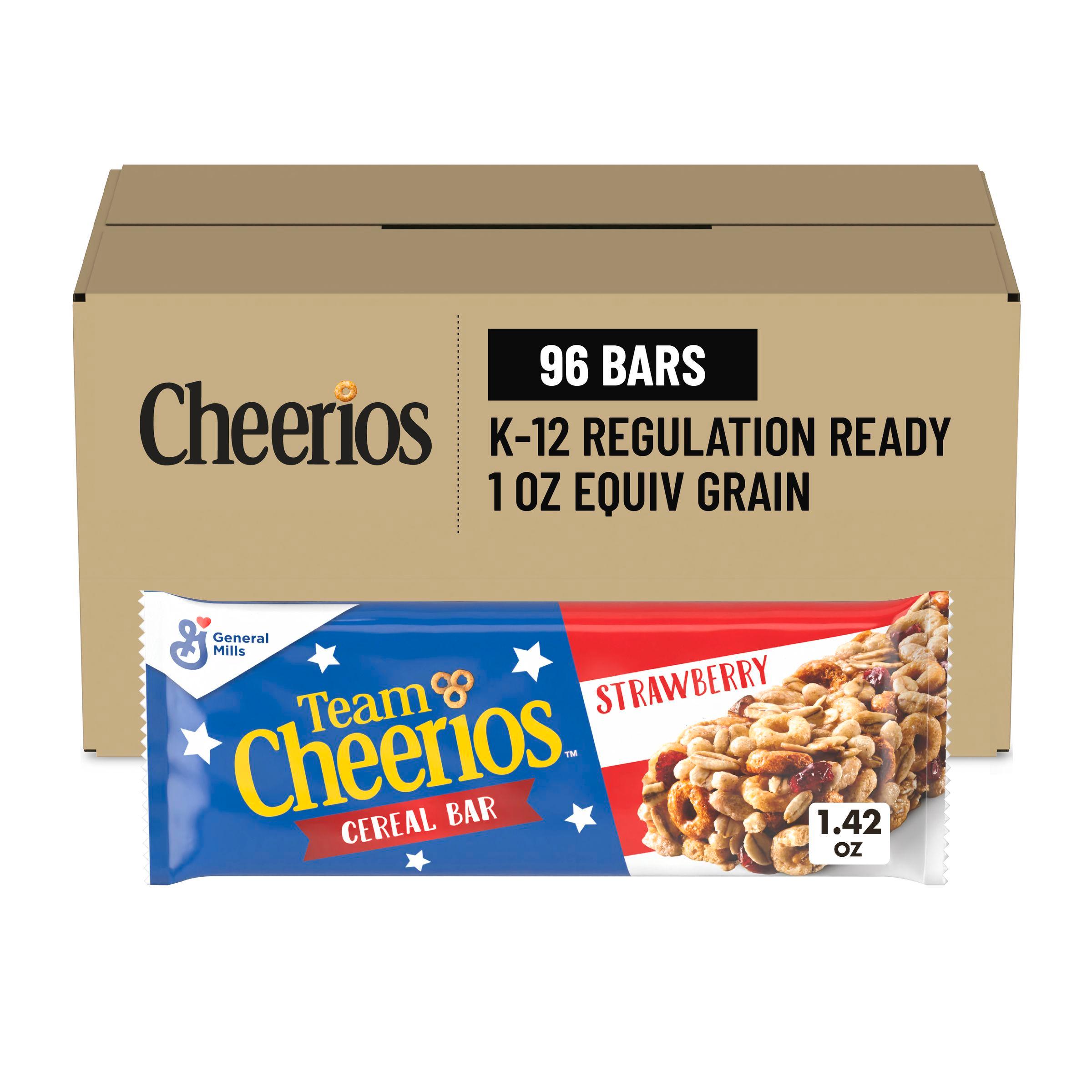 Team Cheerios Cereal Bars are strawberry-flavored, chewy bars made with Cheerios cereal pieces and sweetened cranberries. Individually wrapped and aimed at on-the-go convenience, ideal for classroom snacks. These bars contain no artificial flavors, no high fructose corn syrup, and are made without gelatin. Supplied in bulk with 96 bars of 1.42 oz size per case, meets USDA Smart Snacks criteria and 1 oz equivalent grain.