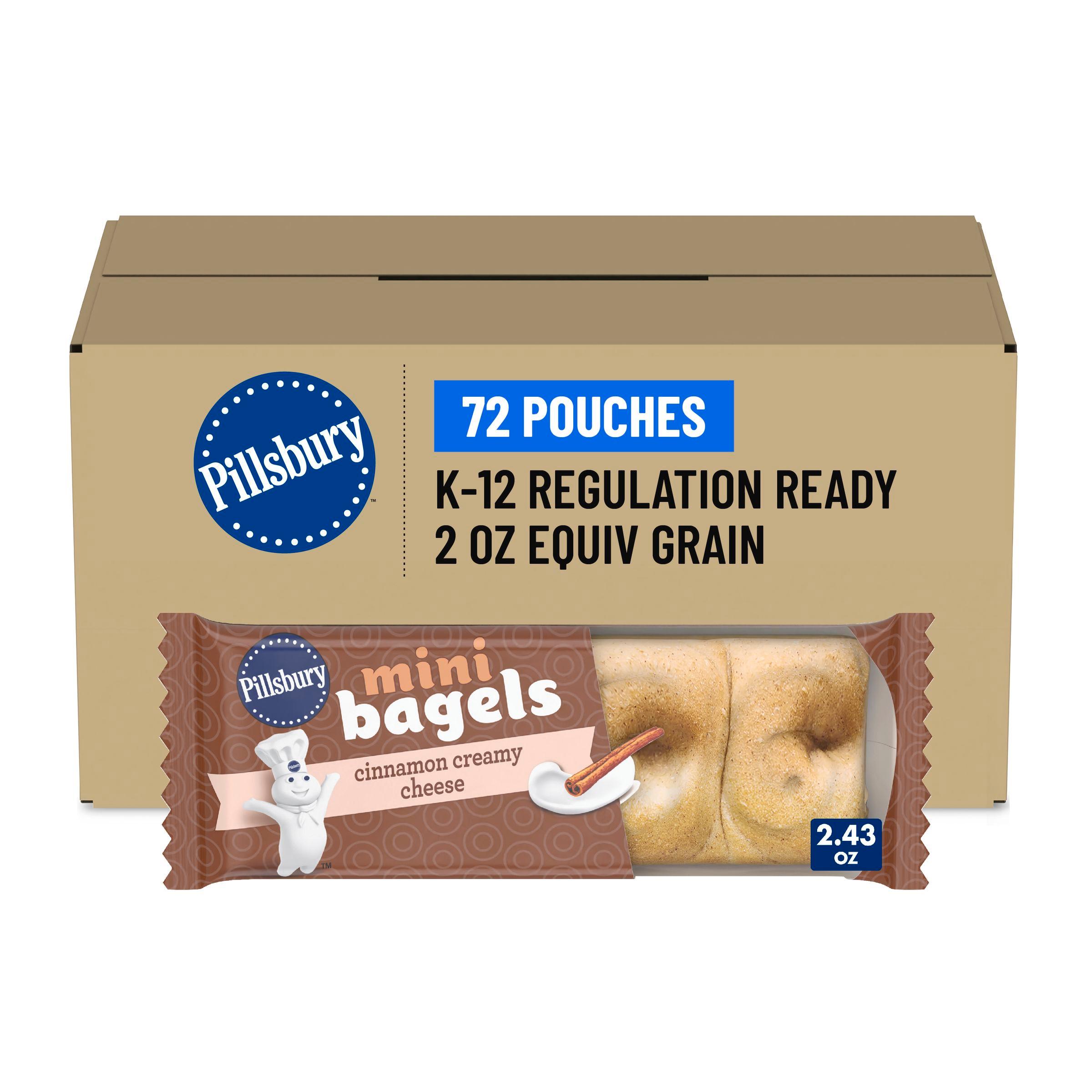 Pillsbury whole grain-rich frozen mini bagels with cinnamon Neufchatel cheese filling. 72 single-serve, ovenable pouches per case, perfect for heat & serve or thaw & serve. No artificial flavors or colors from artificial sources, no high fructose corn syrup, and made without gelatin. Ideal for breakfast in K-12 with trusted Pillsbury deliciousness.