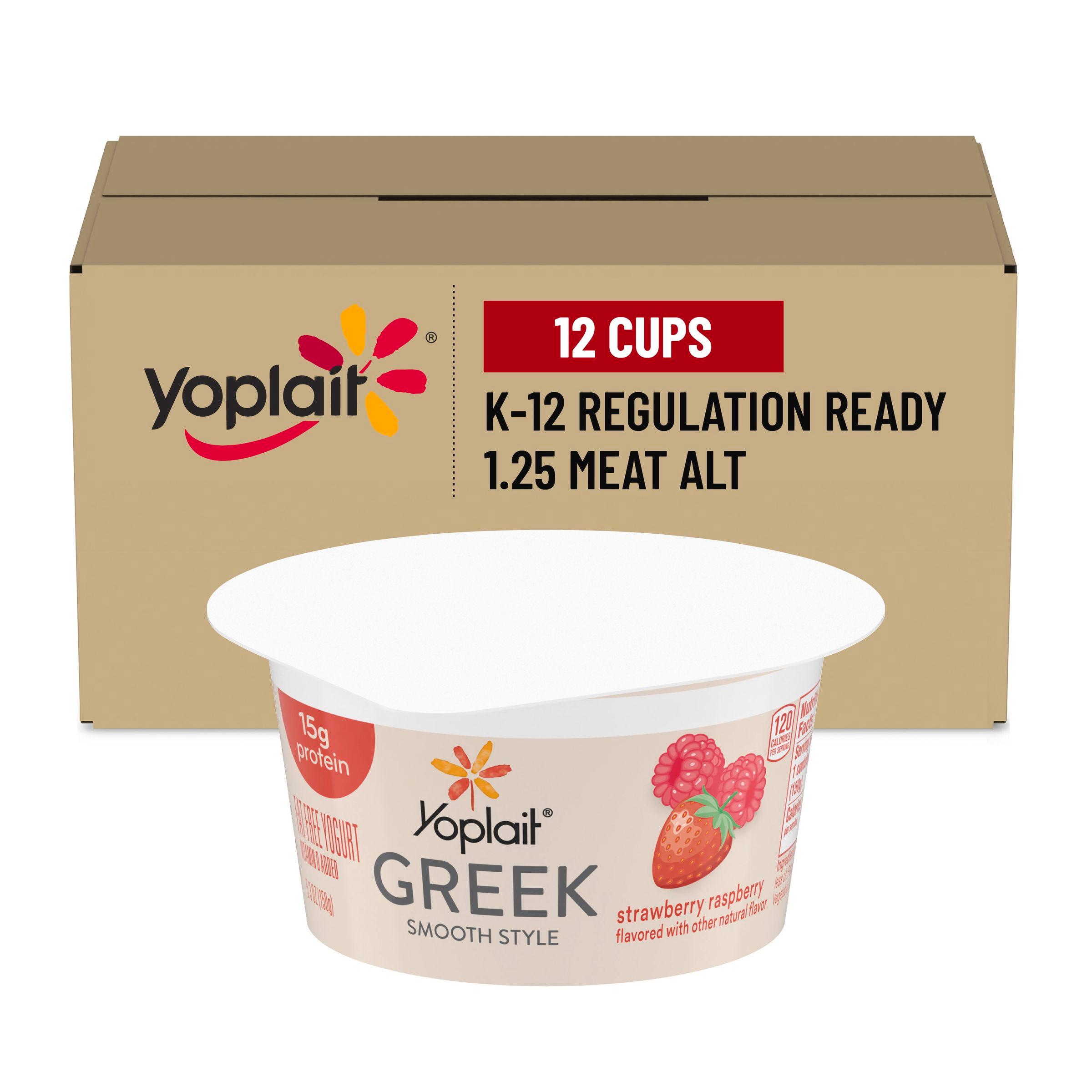Delicious Strawberry Raspberry gluten-free Greek yogurt with 15g protein per serving, perfect for school meals. Yogurt made without colors or flavors from artificial sources. Each case contains 12 single-serve 5.3 oz cups, ideal for controlled portion servings in cafeterias. Meets USDA Smart Snacks criteria and CACFP eligible, supporting school nutrition programs.