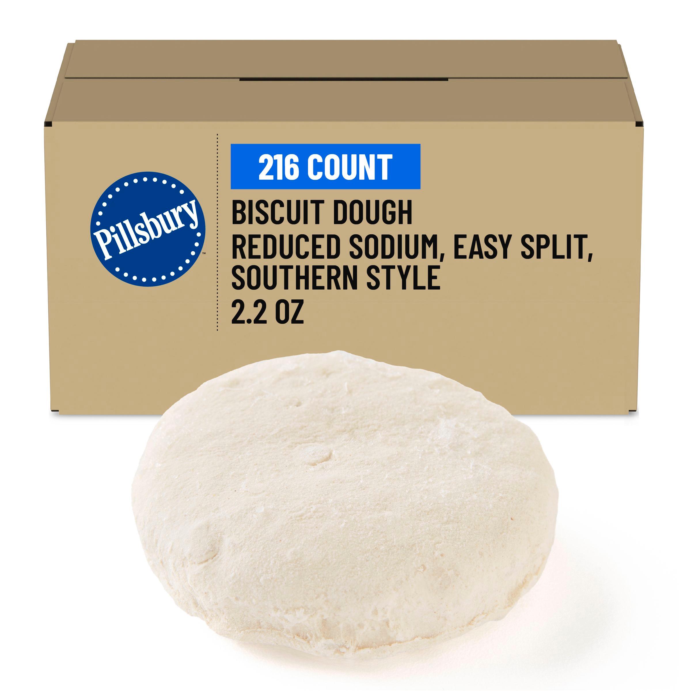 Pillsbury Frozen Biscuit Dough Bulk offers reduced sodium* Southern Style biscuits. Easy prep: place, bake, serve. Perfectly portioned for minimizing waste and ensuring consistent quality. Scratch-like taste and texture. Each 2.2 oz biscuit is light and fluffy, with a rich buttery flavor. Packed 216 per case. Perfect for sweet and savory dishes, ideal for sandwich use. *At least 25% less sodium per serving than 3.17oz Pillsbury Frozen Southern Style Easy Split Biscuit Dough. Sodium content has been reduced from 840mg to 430mg per serving. See nutrition information for saturated fat content.
