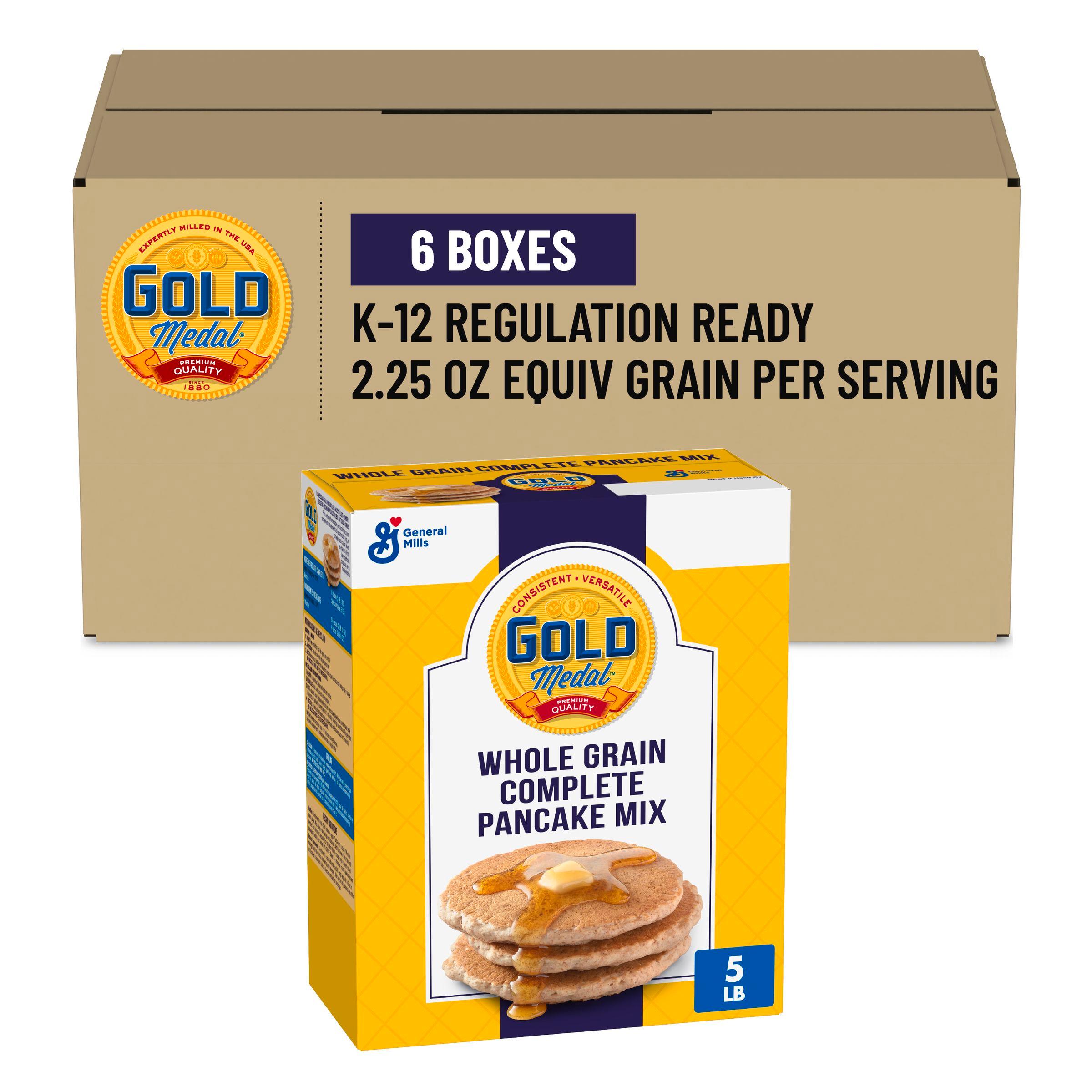 Gold Medal whole grain pancake mix is easy to use, just add water for hearty, great-tasting pancakes made with 100% whole wheat with 39g whole grain per serving (at least 48g recommended daily). Ideal for any time of day, with a scratch-like texture with a golden brown color . This mix is versatile, and ensures consistent quality with forgiving formulas. Available in 6, 5 lb cases, these mixes require minimal labor and hold fresh-baked quality for 24 hours.