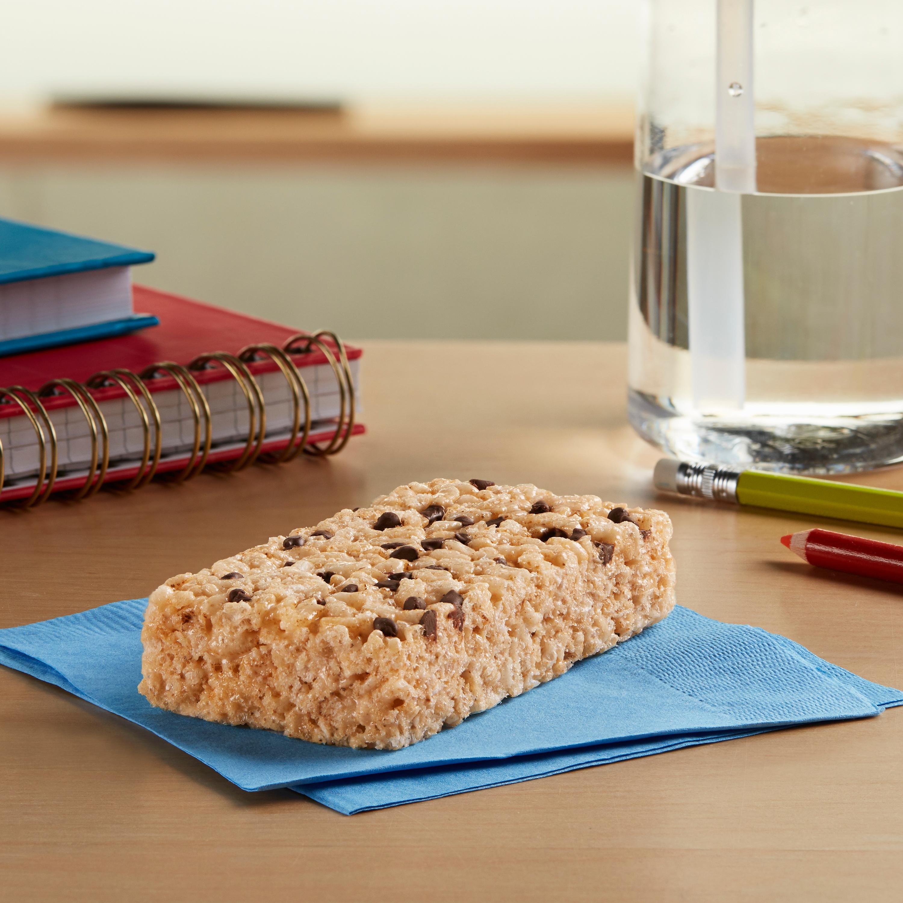 Make student lunches sweeter with Rice Krispies Treats Made with Whole Grain Chocolatey Chip; Each square is made with whole grain and the taste of chocolatey chips and marshmallows for a delicious, ready-to-eat treat. Packaged as 80, 1.59oz squares; Whole grain-rich (17g whole grain per serving) chocolately chip crispy marshmallow square made from puffed, oven-roasted whole grain brown rice and no high fructose corn syrup.