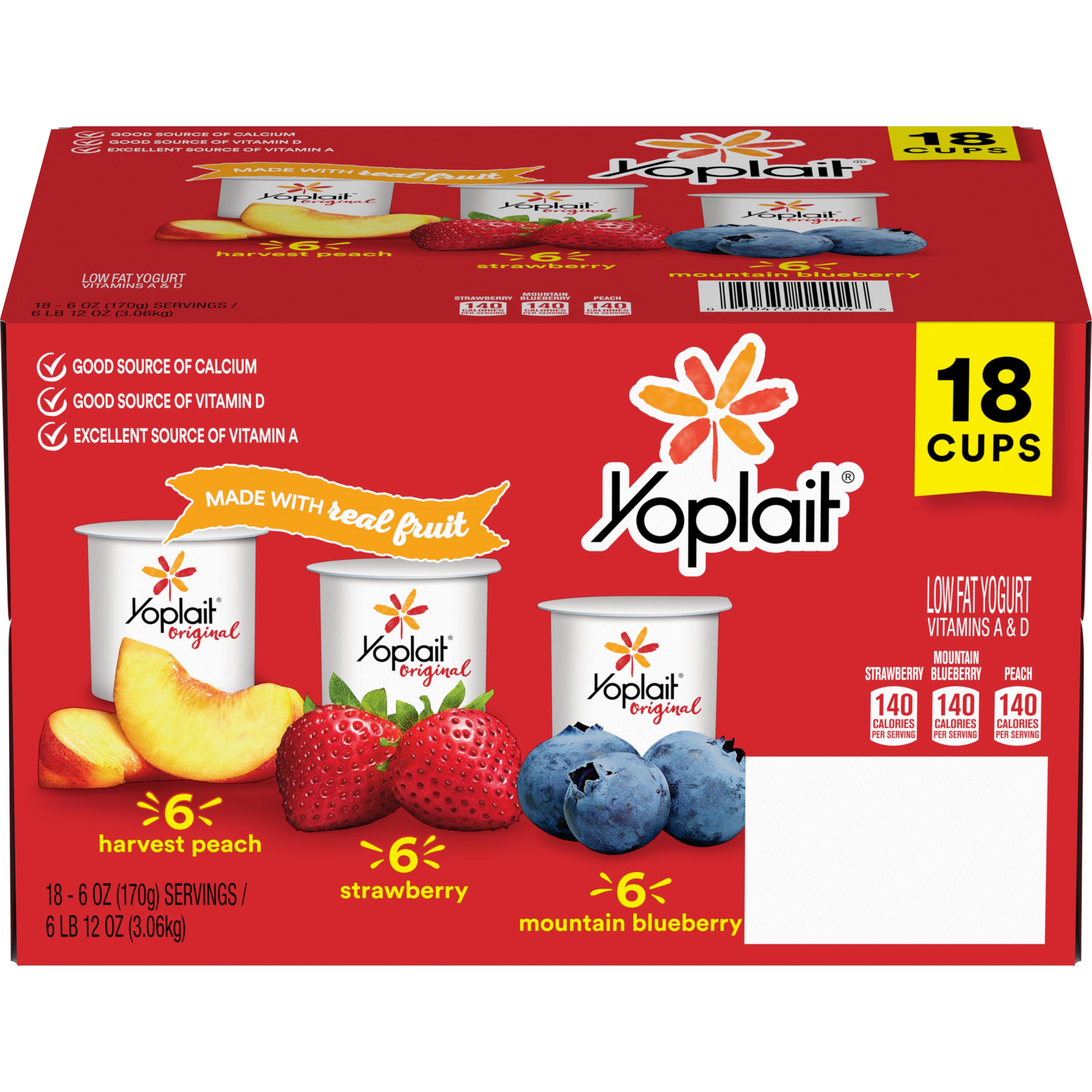 All the nutrition and goodness of yogurt with the delicious blended creaminess of Yoplait®—now with 10% more fruit! This gluten-free yogurt variety pack contains 6g of protein in a 6 oz single serve cup. Made without colors or flavors from artificial sources and no high fructose corn syrup. Variety pack includes: peach, blueberry, and strawberry flavors.