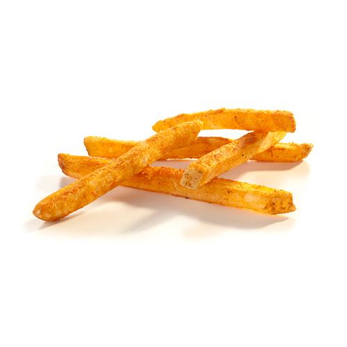 FlavorCrisp Select Spicy Straight Cut 3/8" delivers a bold taste with a unique crispy coating. These fries are an easy way to spice up any dish.