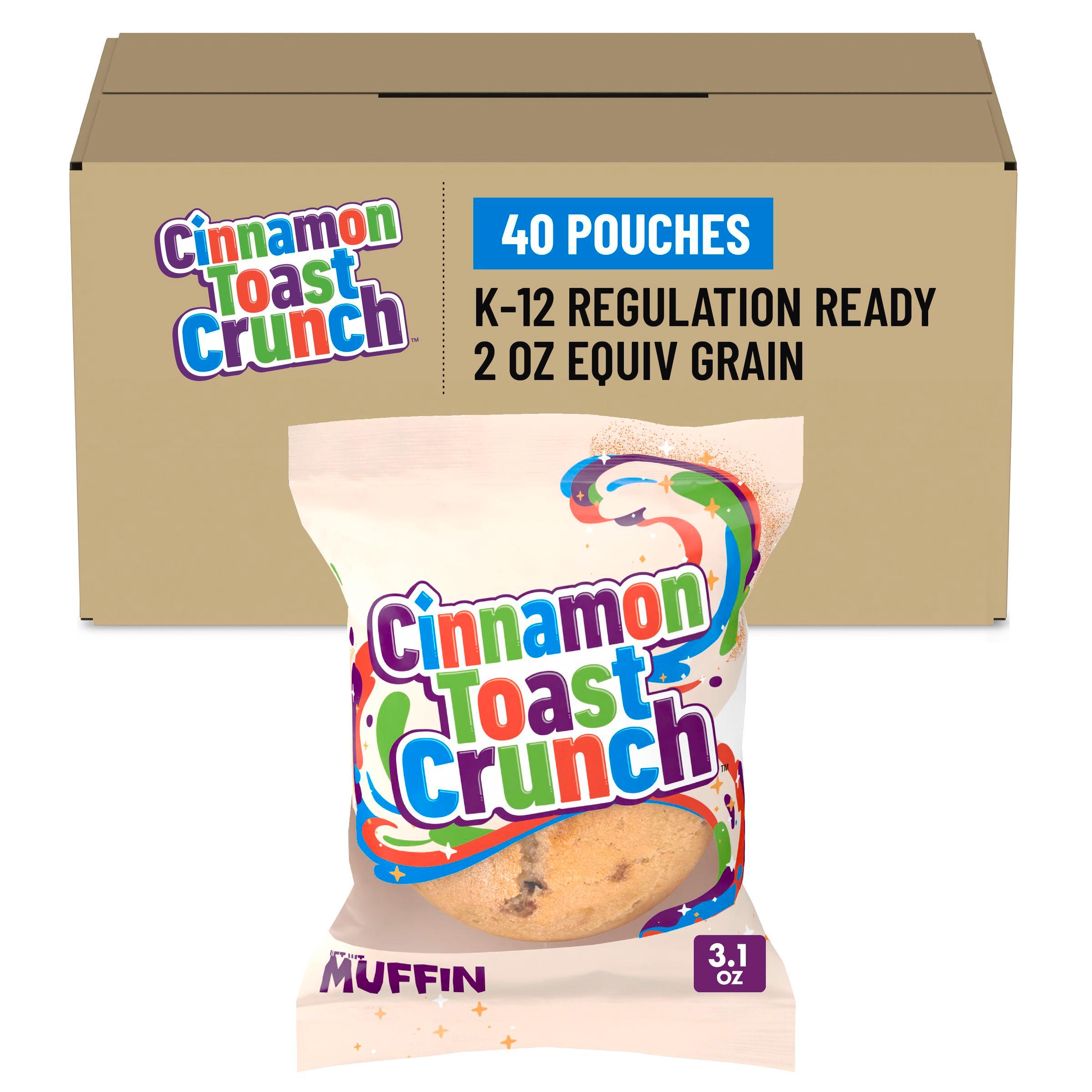 Cinnamon Toast Crunch muffin, individually-wrapped for versatile menu offerings. Perfect for Grab & Go with low-labor prep. Simply thaw and serve for fresh quality over a 5-day ambient shelf-life. Delight in a cinnamon flavor with no artificial flavors and no colors from artificial sources. Whole grain-rich with no high fructose corn syrup or gelatin. CACFP eligible, creditable in USDA Nutrition Programs, providing 2 oz eq grain. Case of 40 pouches, 3.1 OZ each.