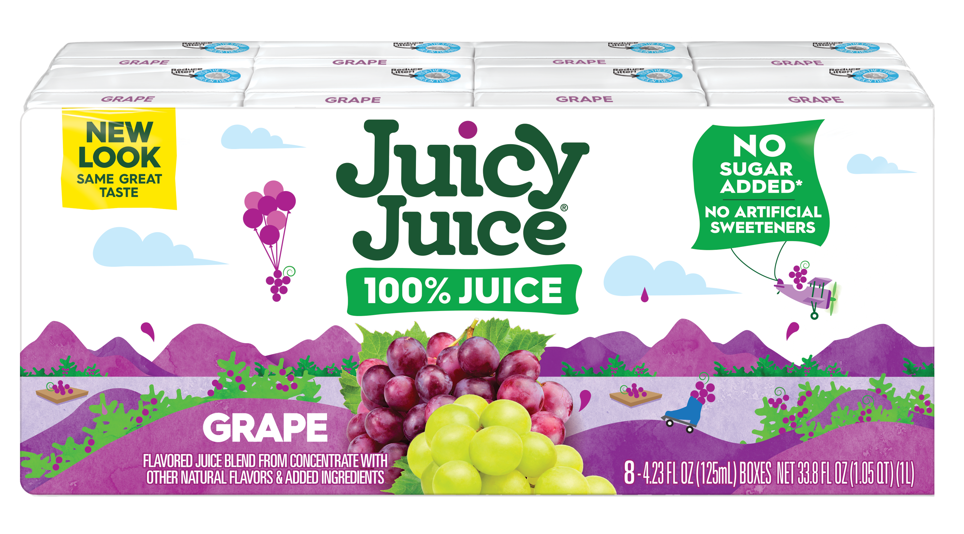 Enjoy the taste of 100% fruit juice with Juicy Juice Grape Juice. The sweetness in this grape juice comes straight from fruit for a delicious grape flavor kids love. With no added sugar, no high fructose corn syrup and no artificial sweeteners, this 100% juice has 1/2 cup of fruit and 60% of the daily value of Vitamin C per kids juice box for a tasty juice drink.