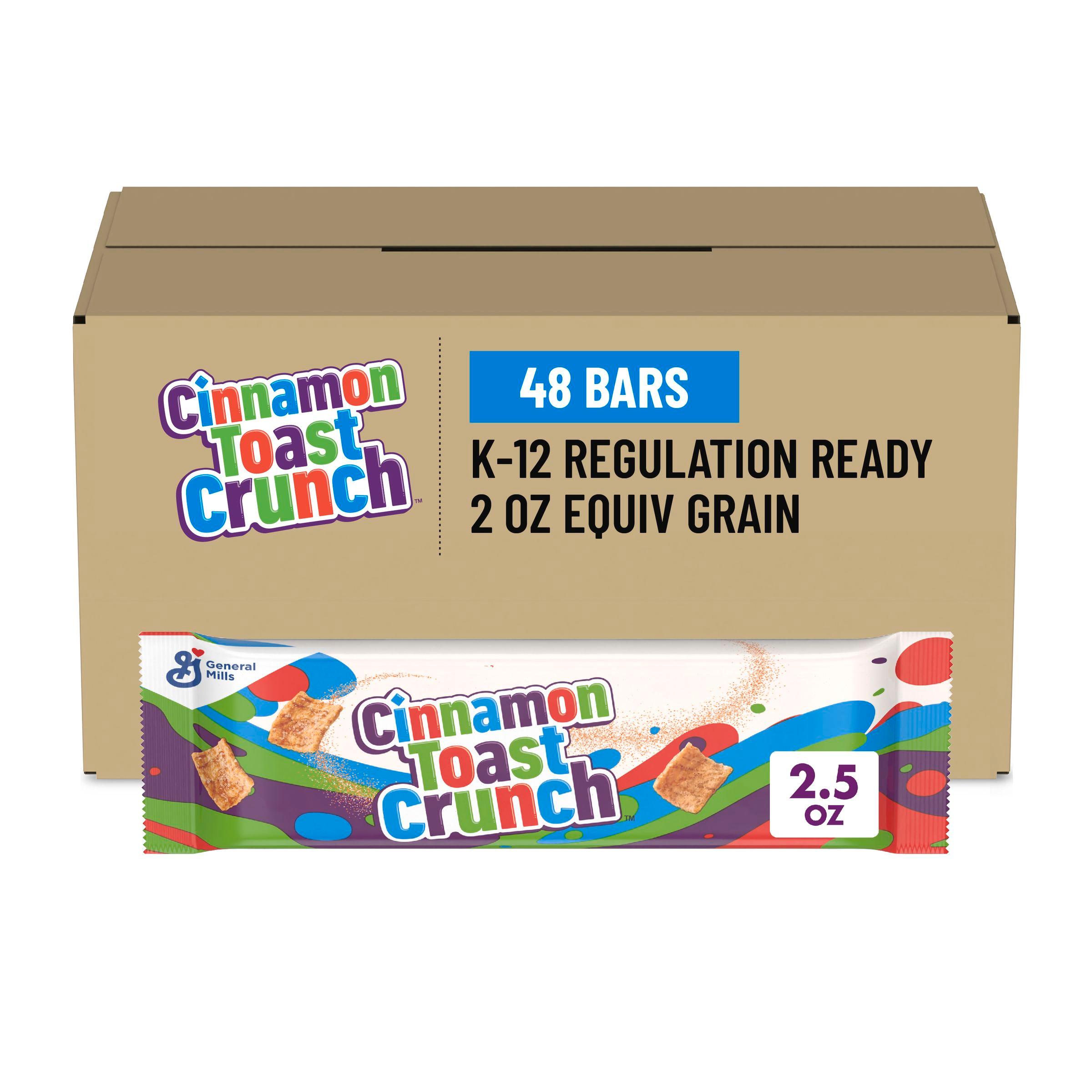 Cinnamon Toast Crunch cereal bars offer a chewy, low -mess snack ideal for breakfast in the classroom or as grab-and-go items. Made with Cinnamon Toast Crunch cereal pieces, great cinnamon taste, and individually wrapped for convenience. No artificial flavors and no high fructose corn syrup, ensuring flavor and quality. Each case includes 48 bars of 2.5 oz each. Meets 2 oz equivalent grain and whole grain-rich criteria.