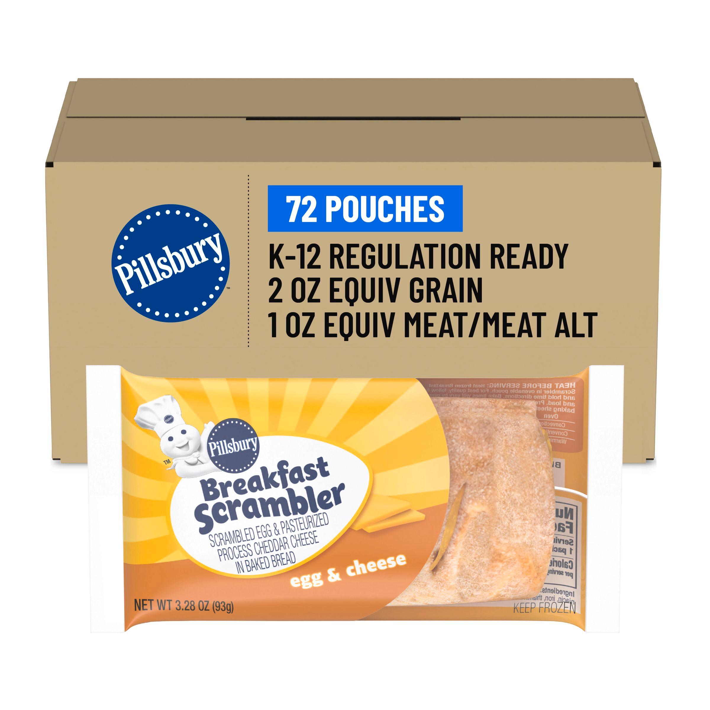 Delight students with Pillsbury Frozen Breakfast Scrambler, made with egg and cheese in a 3.28 oz serving. Each pouch is individually wrapped in ovenable packaging, ideal for fast prep and participation boosting. Providing 2 oz eq grain and 1 meat alternate, it meets breakfast regulations with less mess. Case count of 72 makes it perfect for K-12 settings, offering a delicious, mess-free, whole grain-rich option that's CACFP eligible.