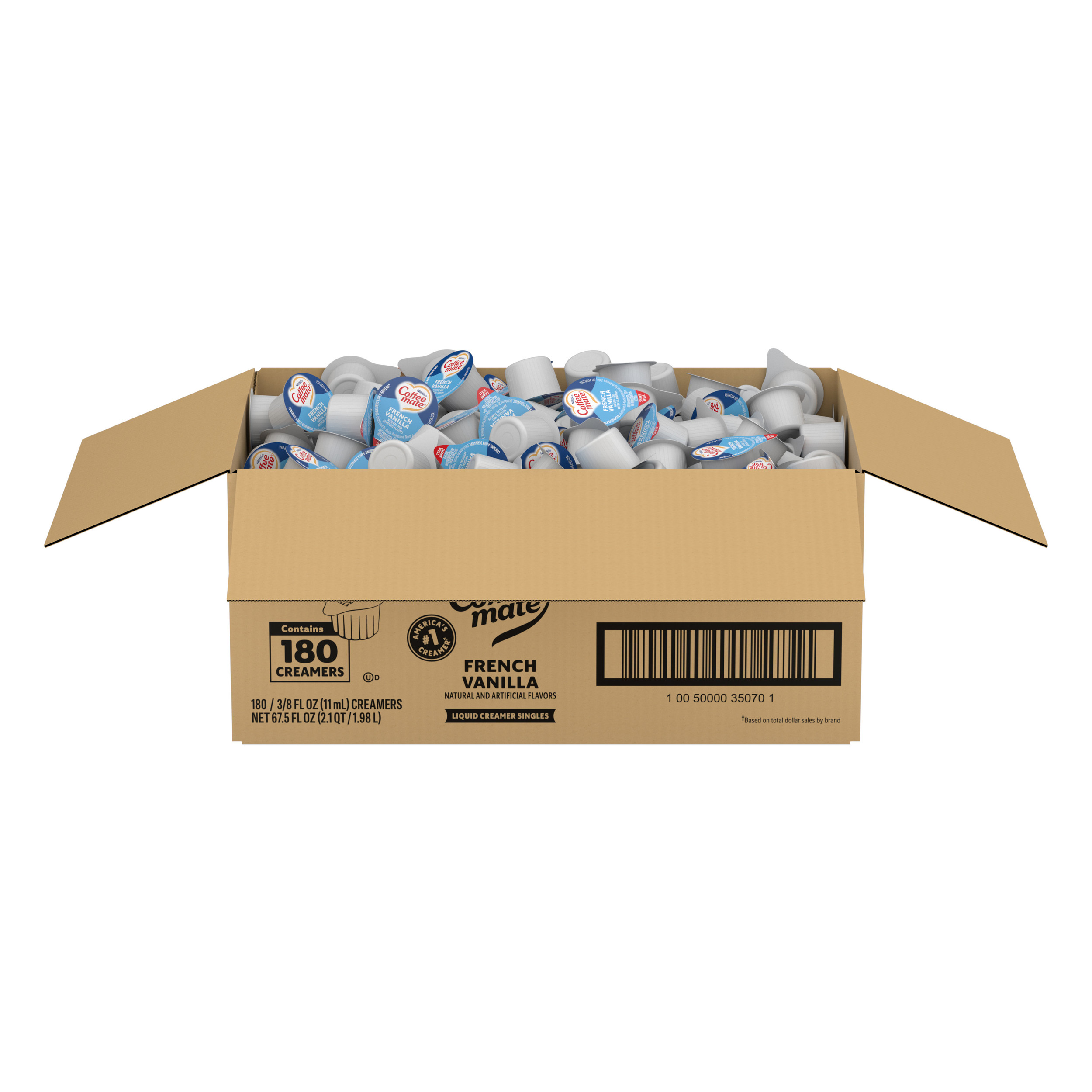 Stir up the perfect cup with Coffee mate, America's #1 creamer brand. Nestle Coffee mate French Vanilla Natural and Artificial flavored liquid creamer singles add a rich and smooth vanilla flavor to your cup of coffee. Available in 180 count, it is shelf stable with no refrigeration needed. Coffee mate French Vanilla flavored liquid creamer singles retain their delicious flavor at room temperature for up to 9 months unopened. Find your perfect match with NESCAFE Coffee and Coffee mate French Vanilla flavored liquid creamer singles. Our Coffee mate liquid creamer singles are available in other popular options like Sweetened Original and Hazelnut Flavored Coffee Creamer. All Coffee mate foodservice single serve creamers are cholesterol-free, gluten free and kosher dairy. With a variety of flavors and formats, Coffee mate has your coffee creamer needs covered. See the full Coffee mate ingredients statement for Coffee mate creamer ingredients.