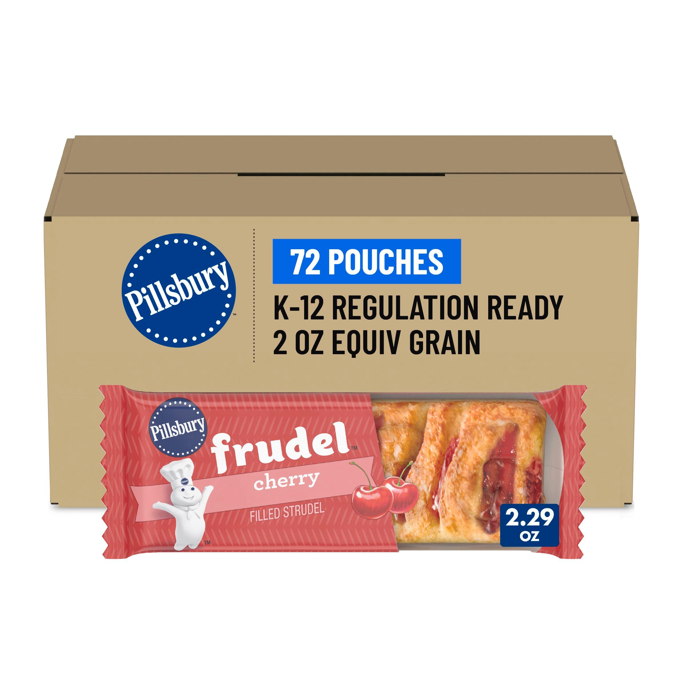 Pillsbury's whole grain-rich frozen Frudel strudel offers a burst of cherry flavor, nestled in easy-to-use individually wrapped, ovenable packages. Each serving contains 16 grams of whole grain (at least 48g recommended daily). With 72 pouches per case, it's perfect for heat & serve or thaw & serve methods. No artificial flavors, no certified colors, no high fructose corn syrup. Ideal for K-12 schools, emphasizing trusted Pillsbury quality for warm, delightful breakfasts.