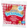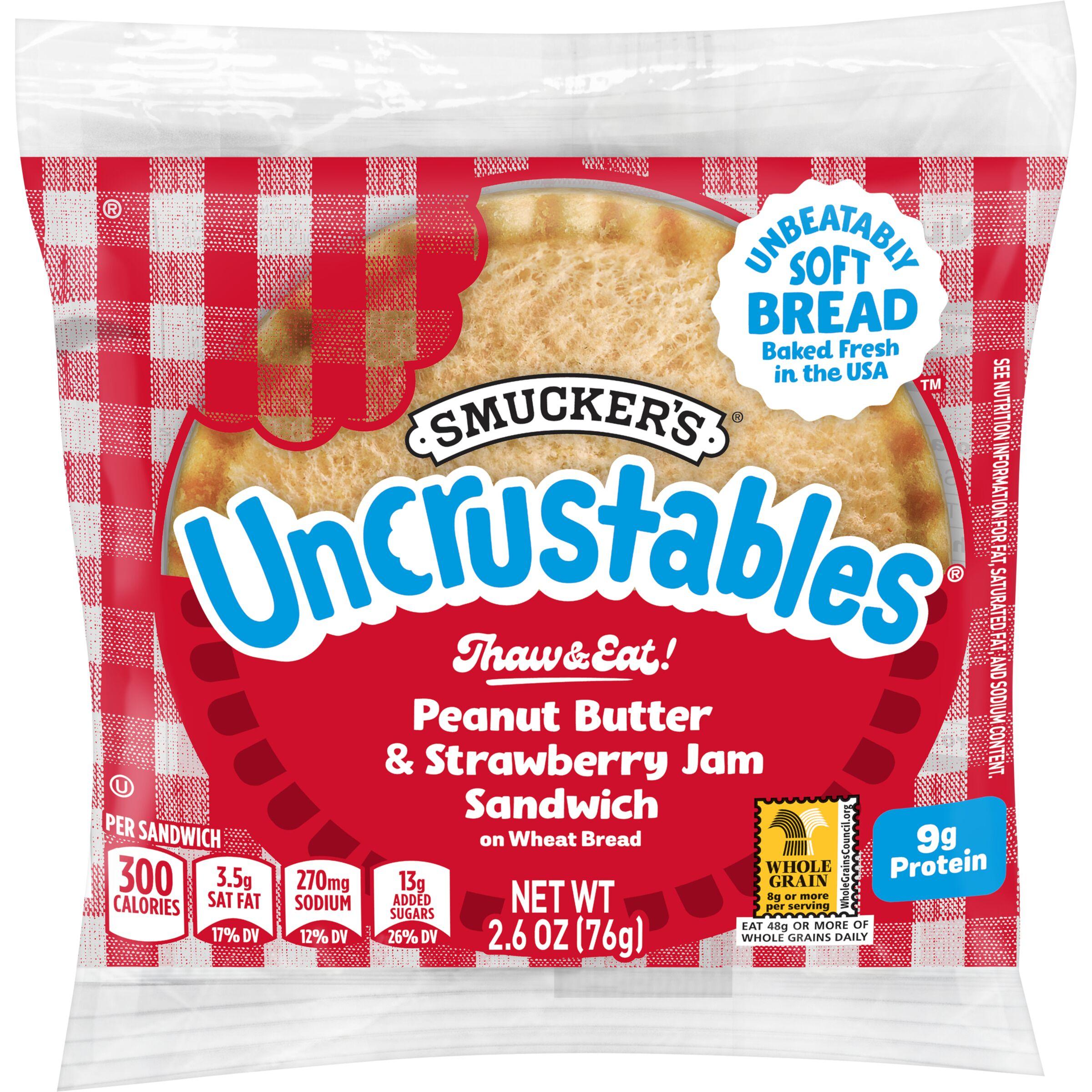 Creamy Peanut Butter and Smucker's Strawberry Jam crimped within a crustless pocket on wheat bread. Each wholesome soft bread sandwich is individually wrapped and frozen for optimal freshness and convenience.