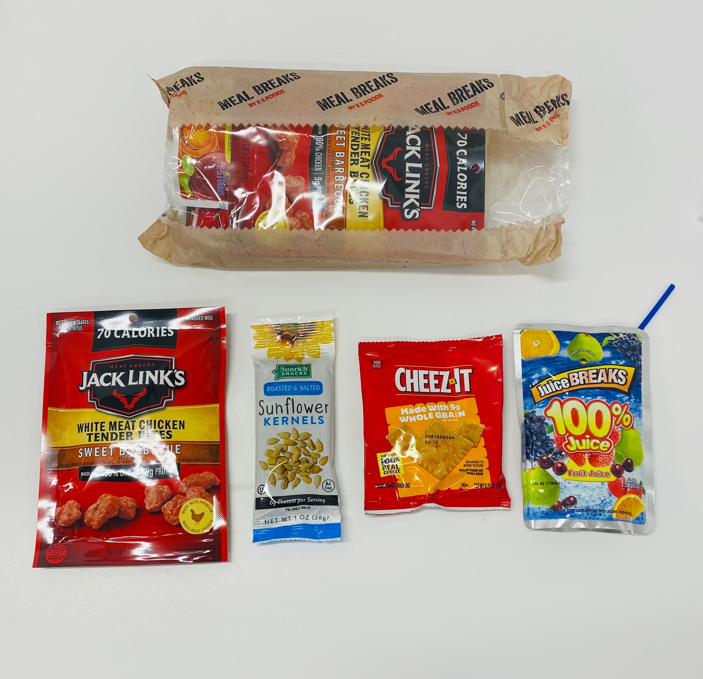 Each serving (1 meal) of Meal Breaks provides 2.0 oz equivalent meat alternate, 1.0 oz equivalent grains, and ½ cup fruit based on the USDA Food Buying Guide requirements