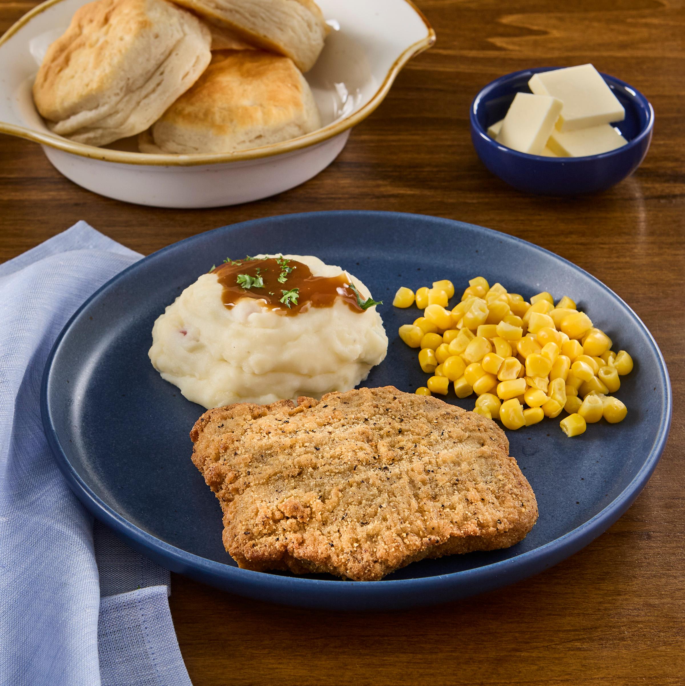 AdvancePierre™ Blue Label Fully Cooked Breaded Country Fried Beef Steak Fritters from Tyson Foodservice deliver the classic, crispy, meaty comfort food that satisfies nostalgic cravings for Southern flavor that customers come back for at breakfast, lunch or dinner. Fully cooked, our 4 oz. country fried beef steak fritters are made with USDA inspected chopped beef, battered with a buttermilk flour blend and coated in lightly spiced wheat flour for a scratch-made look and delicious taste that is rich in hearty flavor. With 15 grams of protein per serving, our pre-breaded and pre-portioned country fried beef steak fritters offer consistent quality and performance—helping to eliminate BOH waste and help cut labor costs. No knife work is required, helping to reduce food safety and cross contamination risks. Easy to heat and serve from frozen using multiple prep methods, AdvancePierre™ Blue Label Fully Cooked Breaded Country Fried Beef Steak Fritters are a versatile choice, allowing operators to utilize their classic, crispy flavor across so many applications from popular breakfast sandwiches and steak and egg plates to lunch menus to main dish dinners smothered in gravy with vegetables and potatoes on the side. Perfect for full-service restaurants, quick-service operations and non-commercial dining spaces for serving the high-quality taste and consistency you’d expect from the brands from Tyson Foodservice.